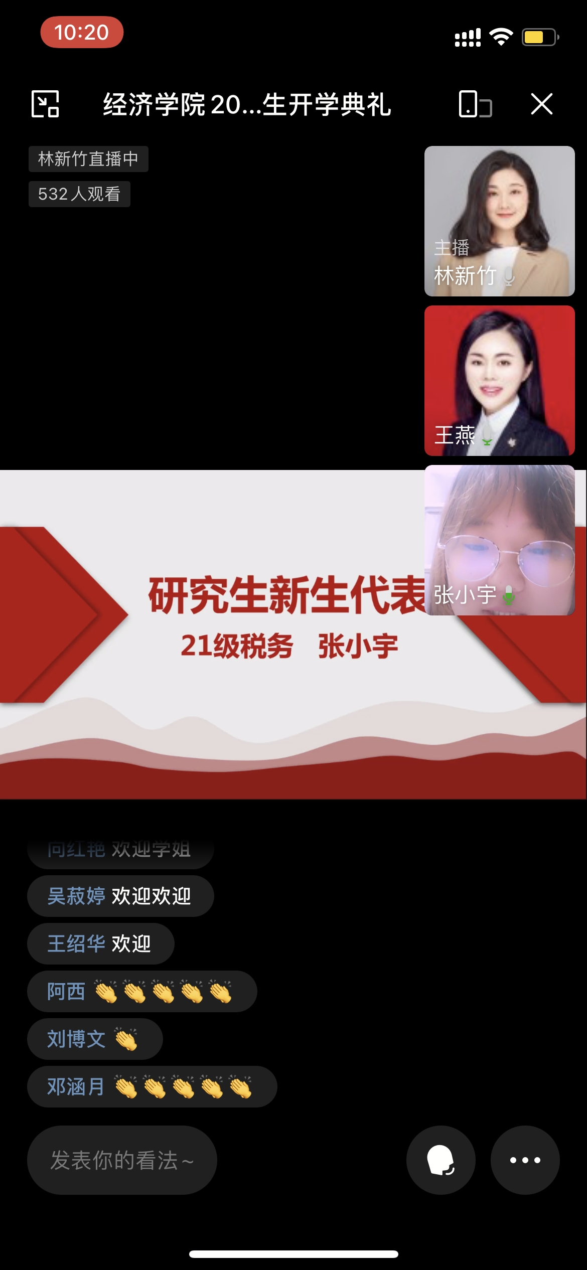 第三项议程高年级学生代表和新生代表进行交流。本科学生代表19级国贸一班左茜雅同学、研究生新生代表21级税务专业的张小宇先后发言。其中左茜雅同学分享了自己在新葡萄8883官网AMG的学习感悟,希望学弟学妹们珍惜大学时光,抓住每一个机会,深入学习专业知识,积极参加各类实践,提高自主性和创新性,把握机会向师者学习,成为兼顾学识和素质的高质量人才;而21级税务专业研究生的张小宇同学,则代表研究生新同学,从学习态度、课程学习、专业理论研究等层面表达了未来刻苦学习的决心,希望未来能够跟学姐学长好好学习,不辜负三年的研究生美好学习时光,努力成为祖国的栋梁之才。
