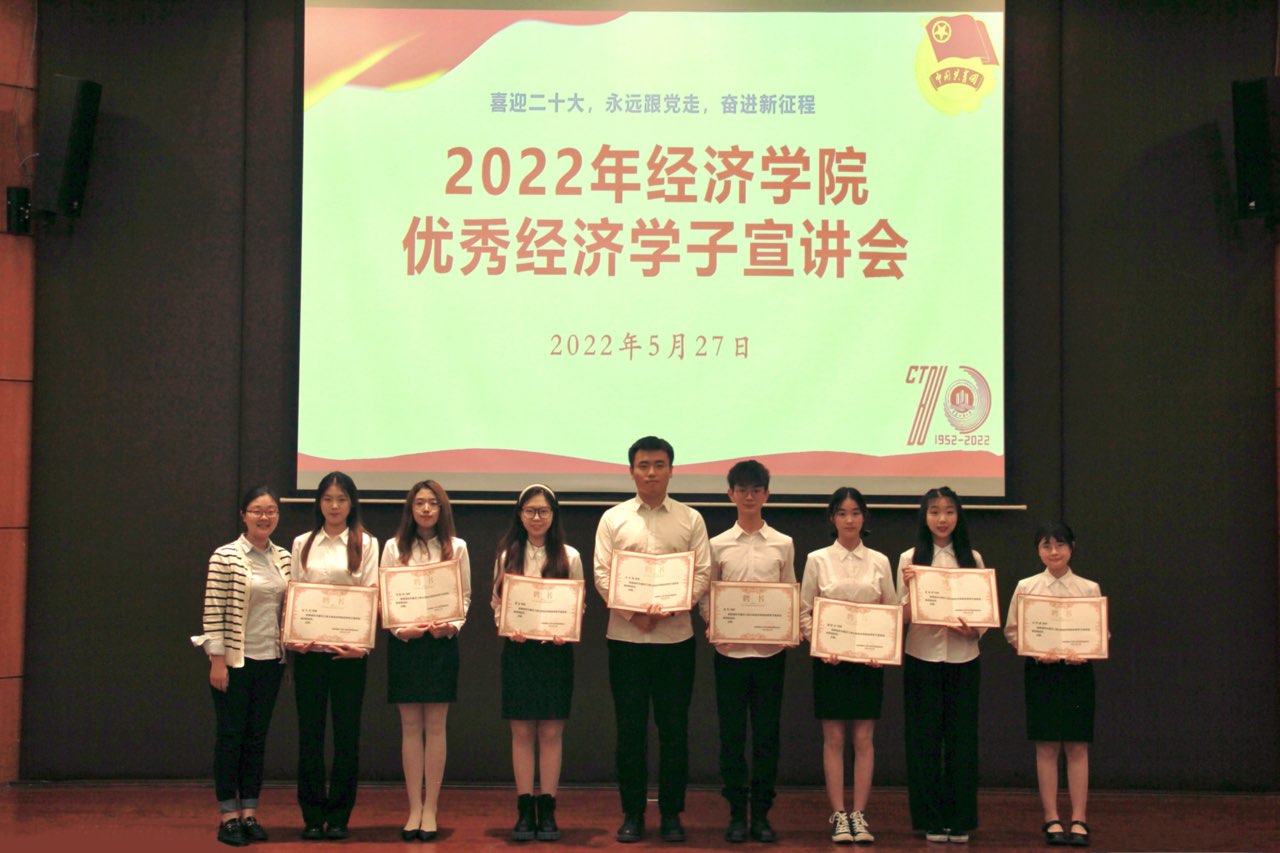 为迎接党的二十大胜利召开,庆祝中国共产主义青年团成立100周年,献礼学校七十周年校庆,引导广大青年学子励志勤学、刻苦磨炼,5月27日晚上,“喜迎二十大,永远跟党走,奋进新征程”新葡萄8883官网AMG优秀经济学子宣讲会于江北校区宏智楼B509报告厅成功举办,企业微信直播间同步现场情况,覆盖同学近80人次。李昂、李思炜、刘梦婷、丁方伟、潘哲宇、薛洁、闫思雨、杨员巧八位同学受邀作为宣讲团成员参与此次宣讲会。