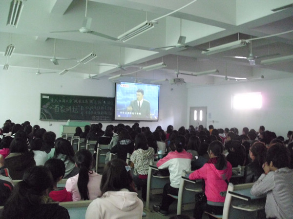 本次“百家讲坛”活动播放了北京人民大学金正昆教授关于“身边的礼仪”之“交往艺术”讲座的影片――«人际交往的艺术»和«商务交往的技巧»。金教授将礼仪解释为:塑造人的形象艺术。并以“礼者敬人也”这句话贯穿整个讲座,把内容分为日常人际交往的艺术和商务交往的技巧两个大的部分。其用幽默风趣的语言和典型的事例将人际交往中的礼仪作了细致的阐述,包括说话的艺术、用电话的礼仪、学礼仪需注意的问题、会客位次的情况、介绍的礼仪、握手的礼仪、名片的礼仪、礼品的礼仪等。同学们均认真倾听,并专心致志地做下笔记。互动环节更是成为本次活动的亮点,同学们热情参与,踊跃提问,相互交流关于人际交往方面的看法,现场气氛十分活跃。