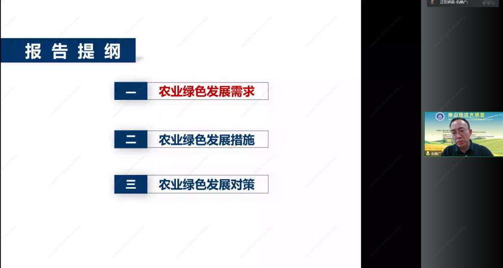为深入学习习近平生态文明思想,本次讲座以“农业绿色发展与生态文明建设”为主题,开启了南山经济大讲堂(第二讲)。仇焕广就讲座主题展开论述。他首先介绍了农业绿色发展的必要性、农业绿色发展和乡村环境治理在美丽中国建设中的重要作用。随后,结合二十大报告精神分析农业绿色发展、乡村环境治理的目标、既有政策措施及落地实效。最后,提出进一步完善的政策建议。在交流发言阶段,来自新葡萄8883官网AMG和长江上游经济研究中心的数名专家学者也就农业绿色发展主题发表了自己的建议与见解,为积极践行习近平生态文明思想建言献策。