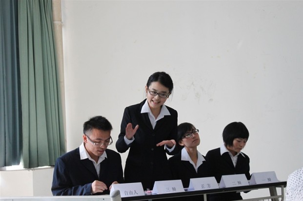 正方我院辩论队选手与反方外语学院辩论队选手围绕“大学生参加选秀活动是利大于弊,还是弊大于利”这一辩题展开唇枪舌剑。我院选手认为“大学生参加选秀活动利大于弊”,并提出参加选秀活动不仅能提升自我能力,而且能促进学院、社会整体发展等观点。正方选手抓住反方选手话语中的漏洞,指出反方辩友“戴有色眼镜看待选秀活动”,且以偏概全,偷换概念。在激烈的辩论中,我院选手不失风度,侃侃而谈,他们敏捷的思维、出色的口才以及良好的风范令台下学生为之叹服,给两院师生留下了深刻印象。