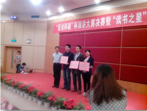 2013年5月17日,在博智楼7200报告厅隆重举行了“‘爱迪克森杯’演讲比赛决赛暨2012读书之星”颁奖典礼,首先由十位参赛选手围绕新媒体时代的阅读方式主题进行了精彩的演讲,之后由学校黄杰老师对演讲比赛进行了点评,并勉励大家,要有思想,要结合现实,要很好地了解新媒体,扎扎事实读书,吸收人类优秀的文化成果。然后举行了2012读书之星颁奖典礼,新葡萄8883官网AMG有黎黎,林建,刘鸿佼,张甲鹏四位同学获得了2012读书之星的称号,最后由陈运超副校长做了总结,并鼓励大家好读书,读好书,做一个有起码修养的大学生,此次活动由新葡萄8883官网AMG图书馆主办。