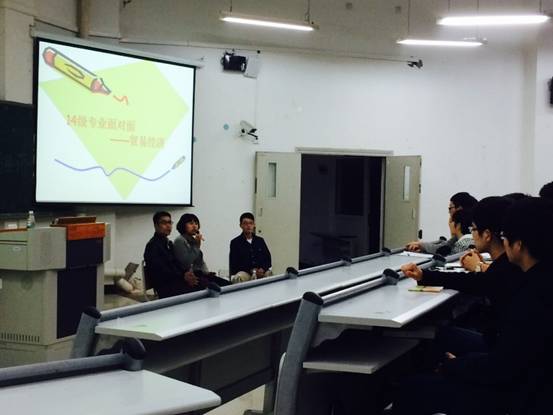 2015年3月25日晚7时,针对2014级贸易经济专业学生、旨在促进对专业学习与学业规划的专业“面对面”座谈会在兰花湖校区广智楼20211拉开帷幕。出席本次专业面对面活动的有新葡萄8883官网AMG党总支雷菁副书记、贸易经济系主任宋瑛副教授、重庆商社崔连吉校友和贸经大四学生彭陈以及全体2014级贸经专业学生。
