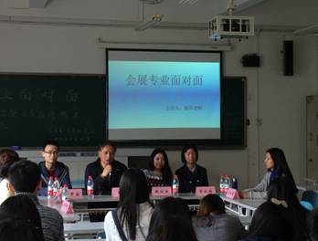 3月25日下午,由新葡萄8883官网AMG主办、C&E(会展)研究会承办的“会展专业面对面”活动在江北校区B303教室举行,2015级会展经济与管理专业全体学生和部分C&E(会展)研究会会员参加了活动。本次活动采取沙龙会议的形式,邀请了会展专业教师杨军副教授、会展专业优秀毕业校友魏欣然以及会展专业大四、大三的5名优秀学生参加了这次活动。