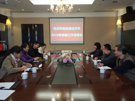 1月8日上午10点,新葡萄8883官网AMG贸易经济系召开了2016年度系部总结会议,对2016年度工作进行了认真梳理与总结,对经济学“三特”学科专业群贸易经济专业建设方案、商品学校级虚拟仿真实验课程建设工作进行研讨。会议由贸易经济系主任杨海丽主持,贸易经济专业负责人曾庆均教授、学院主管教学副院长宋瑛副教授以及贸易经济系全体老师参会。