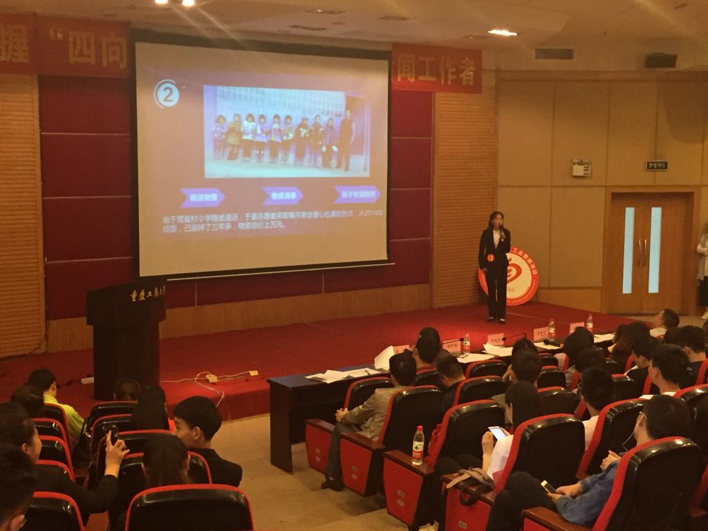 为进一步深化志愿服务育人功能,扩大义工志愿服务的社会影响力。2017年4月21日下午第二届新葡萄8883官网AMG“义火薪薪”志愿服务项目大赛在7200报告厅如期举行。重庆第二师范学校团委马洁书记、学校各职能部门领导及来自西南大学,重庆交通大学等高校的志愿者代表作为大赛的评委出席此次大赛。