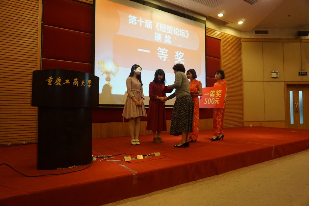 活动伊始,分党委王小玲书记介绍了“经贸论坛”活动的概况:在优秀校友赞助支持下发起,至今已经顺利开展十届,是我院具有专业特色的学生活动平台,本届“经贸论坛”受到广大师生积极投稿支持,经过层层评审筛选最终收录20篇优秀论文。分党委于频副书记上台公布获奖名单,由学院领导为获奖同学颁奖,优秀的获奖同学赢得在场观众的阵阵掌声。14级经济一黎润娟作为获奖同学代表发言,黎润娟与同学们分享了自己参加《经贸论坛》的收获。