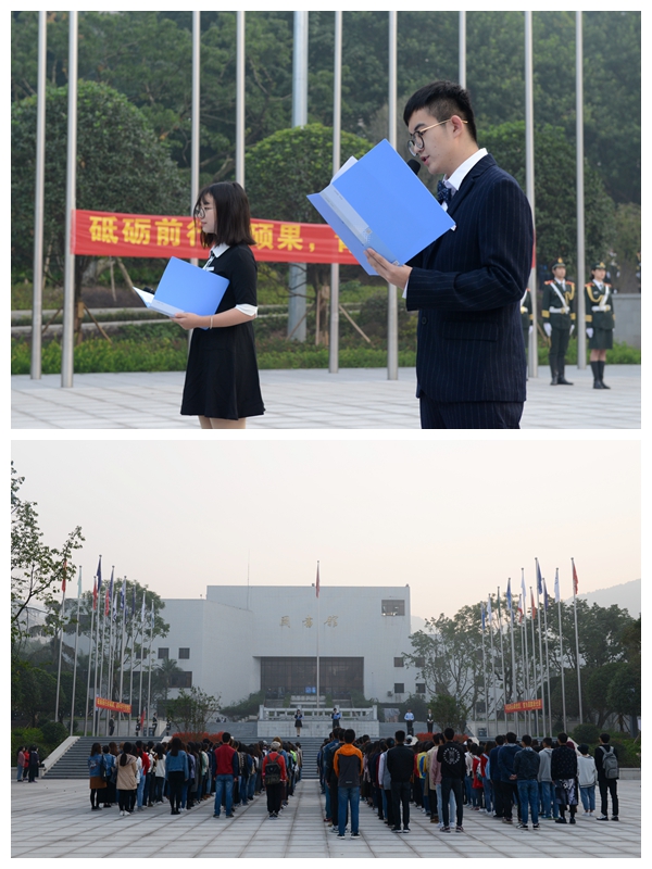 行礼完毕,由新葡萄8883官网AMG党员服务站站长李晶晶同学带领同学们宣誓。同学们面对庄严的国旗许下铭记“厚德博学,求实创新”的校训,践行“含弘自强,经邦济民”的精神,不忘“肩负责任使命、服务社会人民”的重任,喊出“为祖国富强勤奋学习,为民族振兴奋斗终生”的誓言。