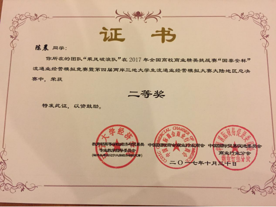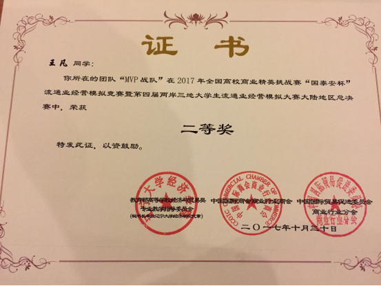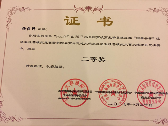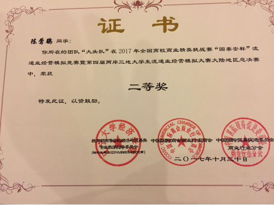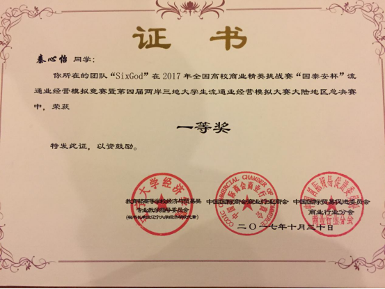 本次比赛从4月份报名到10月份总决赛结束,历时6个月分为3个阶段:知识赛、预选赛、大陆地区总决赛。我院共有43名学生参与知识赛,32名同学参与预选赛,22名同学参与总决赛,全部来自我院2015级和2016级贸易经济专业学生。其中秦心怡同学带领的“Sixgod”队获得一等奖;陈晨同学的“乘风破浪”队、陈莺鹛同学的“大头”队、杨苡轩同学的“FourV”队、王凡同学的“MVP”队分获二等奖。