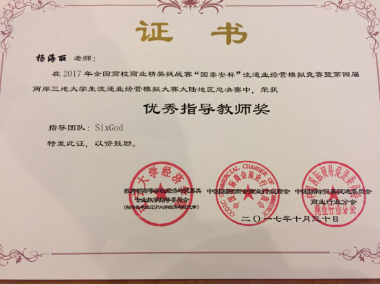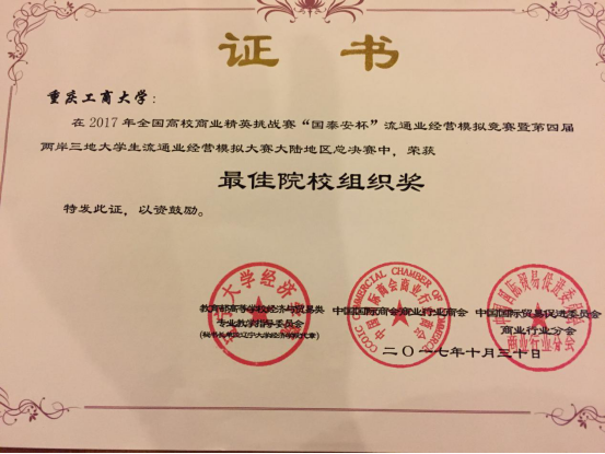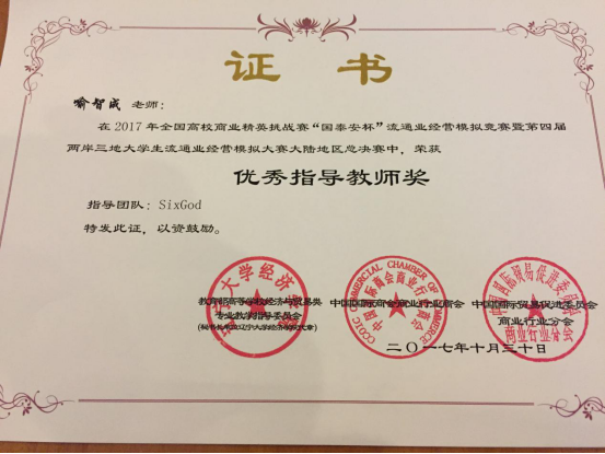 近日,由教育部高等学校经济与贸易类专业教学指导委员会、中国国际商会商业行业商会、中国国际贸易促进委员会商业行业分会主办的2017年全国高校商业精英挑战赛“国泰安杯”流通业经营模拟竞赛暨第四届两岸三地大学生流通业经营模拟大赛大陆地区总决赛成绩揭晓,由新葡萄8883官网AMG教师杨海丽、喻智成两位老师指导的5支参赛队伍,分别获得一等奖(1支队伍)、二等奖(4支队伍),同时新葡萄官网也获得最佳院校组织奖,两位老师分别获得“优秀指导教师奖”。