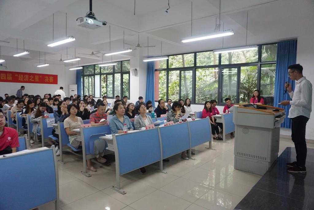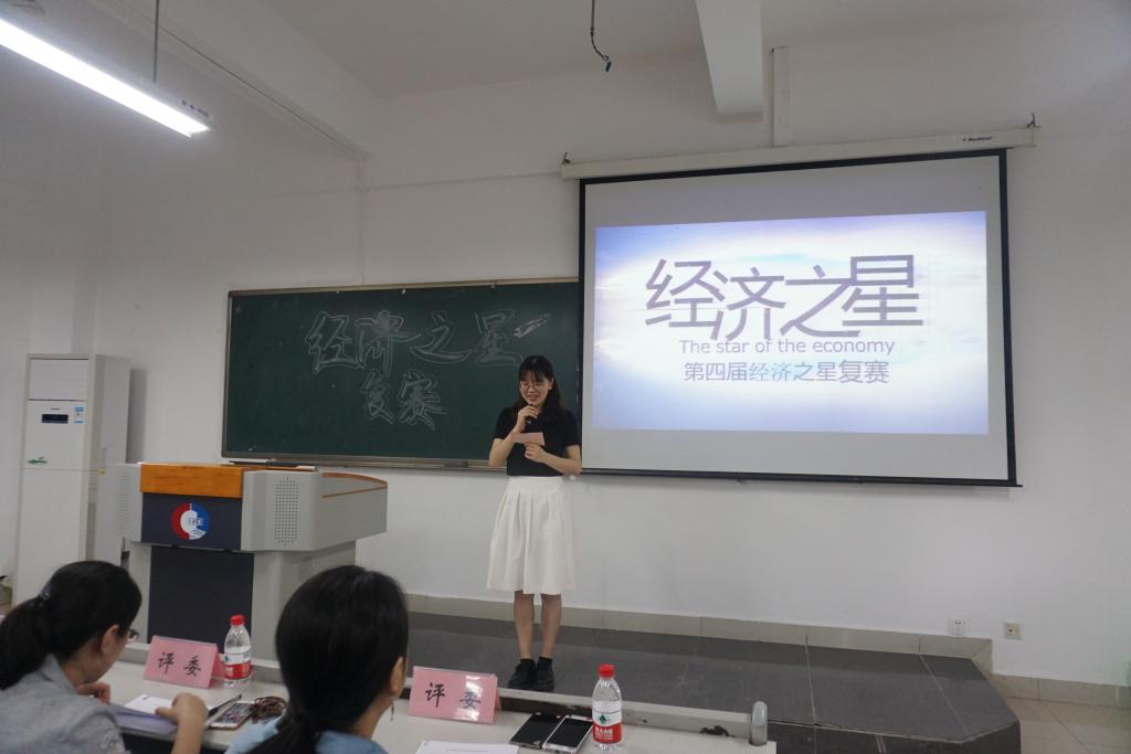 5月初,通过同学自荐、老师同学推荐等方式,确定候选名单,学院邀请教师代表对候选同学材料进行评选,最终确定12名同学进入决赛答辩。5月25日,第四届“经济之星”复赛在田家炳408举办,新葡萄8883官网AMG分党委于频副书记,贸经系主任杨海丽老师,国贸系王美英老师,经济系何泱泱老师,学团办主任杨华俊老师,分团委书记蒋敏老师及学团办辅导员老师们担任此次活动的专业评审,同时来自新葡萄8883官网AMG14、15级各班的大众评审共同参与了此次评选。决赛分为两个环节:PPT展示和现场答辩。PPT展示阶段,参加复赛的选手们对自己的实践经历、获奖情况等进行了展示。“学习之星”优异的成绩单、“实践之星”丰富的实践经验、“科技之星”充满创新意识的成果、“文艺之星”精彩的文艺展示、“公益之星”感人的志愿服务经历、“体育之星”曾获的众多比赛名次,都让在座的同学们深受鼓舞。现场答辩阶段,由评委老师们随机向选手进行提问,选手们的回答让现场响起阵阵掌声。