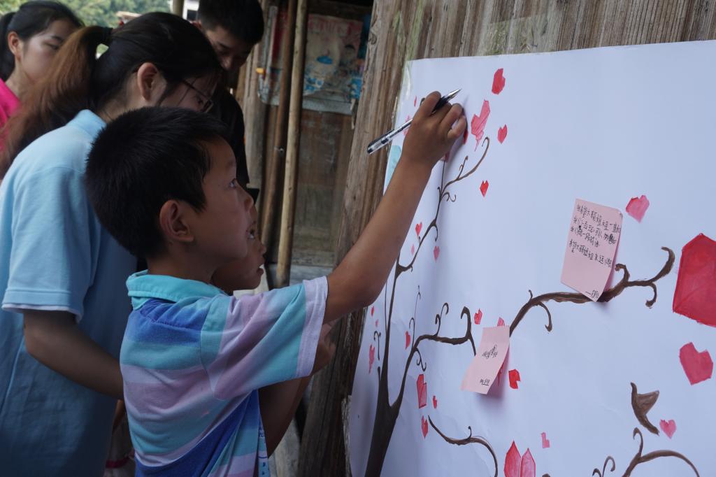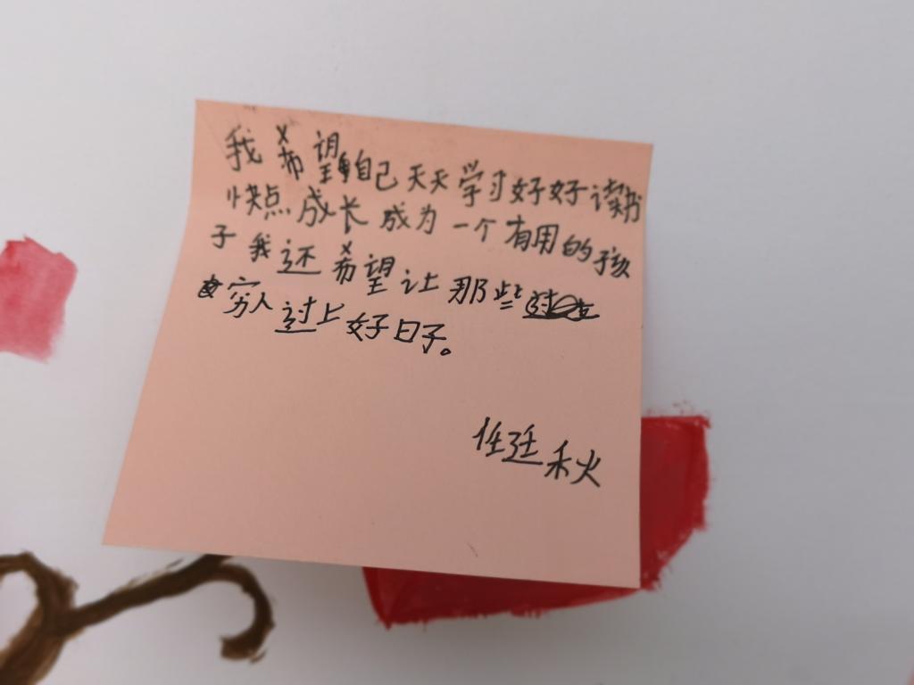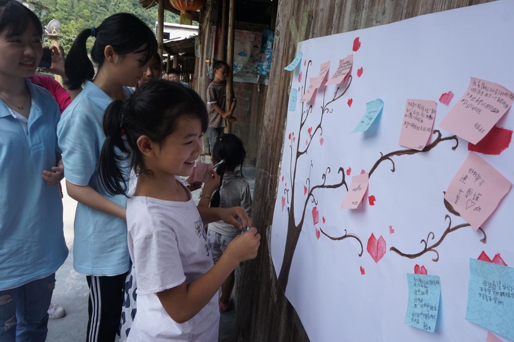 为了更好地帮助这些孩子,新葡萄8883官网AMG定期给这里的孩子寄出爱心包裹。今年暑假,新葡萄8883官网AMG实践队成员们再次来到营盘村小学,开展了为期一周的教育关爱活动,其中为了更好地开展爱心包裹项目、了解孩子们的需求,实践队员们特地准备了“心愿树”活动。活动伊始,孩子们安静地坐在座位上,等待实践队员们为大家分发笔和纸。孩子们拿到笔后,实践队员在一旁耐心地与孩子们沟通,逐步引导孩子讲出自己的心愿,孩子们低头认真地在纸上写着自己的愿望。写好自己的心愿后,孩子们小心翼翼地将心愿纸贴到心愿树上,两只小手用力地将它粘在上面,期盼着他们的愿望能够早日实现。