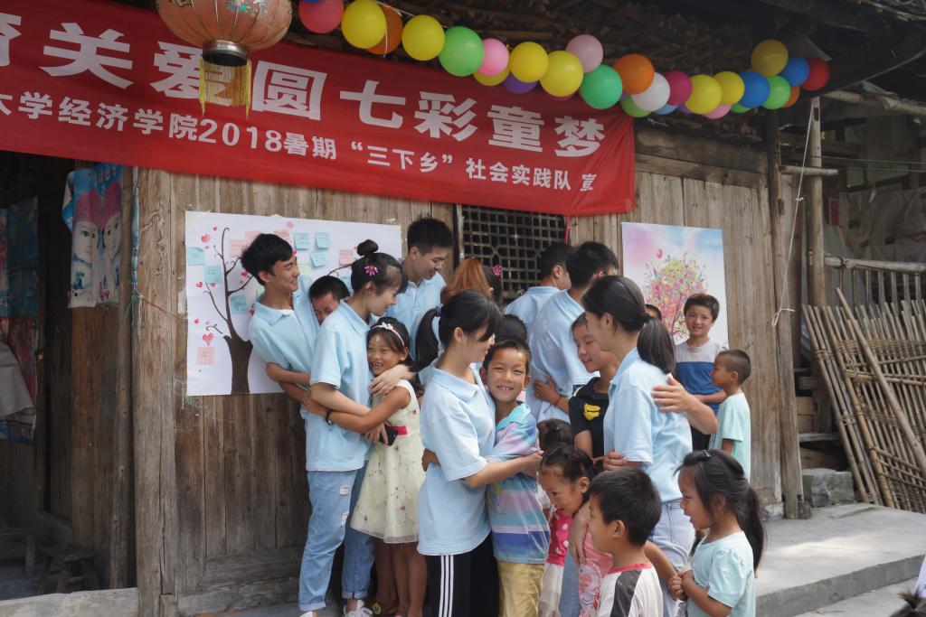 “虫儿飞,虫儿飞,你在思念谁”,孩子们稚嫩的歌声回荡在这个小小的村落;孩子们以一曲《苔》表达了对未来坚定的希望,用手语展现着苔花的精神风貌,也展现了他们不屈的生命力;最后实践队员们带来一首《当爱在靠近》,歌声嘹亮,带着实践队员们的愿望——“尽自己所能让山区孩子们感受到爱与温暖”。歌声一停止,孩子们便冲了上来,紧紧地拥抱着实践队员们,感谢他们这几天悉心的教导与耐心的陪伴。离别就在此刻,唯有以欢笑热泪冲散满怀的不舍。