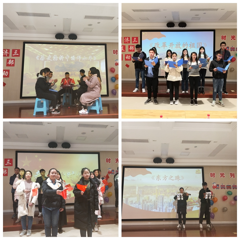 本次活动在主持人的宣布正式开始后,同学们齐唱团歌,在雄壮的团歌声中,大家乘坐时光列车,一同回首了我国改革开放四十年来的变化。第一站,话剧表演《历史转折中的邓小平》让大家感受到了改革开放初期的不易,更加珍惜今日的成就;第二站,同学们用小合唱《走进新时代》向大家展示了改革开放中人们的欢快喜悦;第三站,李宜轩同学和张晓晗同学的曲艺表演《东方之珠》让大家真是感受到了国家实力的变强,经济实力的不断提升;在列车停靠期间,进行了《一站到底知识竞赛》,让大家更加了解改革开放的历史事件,在这一环节,同学们的参与度极高;激烈的知识竞赛后,时光列车继续前行,来到改革开放的第四站,在改革开放四十周年之际,同学们满怀激情的朗诵了《改革开放的中国》,紧随其后的曲艺表演《三句半》让同学们更加了解改革开放四十周年来在经济、文化等方面的巨大变化以及成就。经过了这几站,同学们积极踊跃的发表了自己的看法,对祖国的未来发展抱以极大的信心,相信祖国会越来越好。在团日活动的结尾播放了同学们精心准备的感言视频,结束了这次旅行。最后,于频副书记对此次活动进行了点评,她认为:此次活动主题鲜明、内容丰富,节目编排上很有新意,同学们参与度高,利用团日活动的舞台展示了同学们话剧、演奏、唱歌、朗诵、绘画等多方面的才艺,给了我们很多的惊喜,鼓励同学们以此热情延续到今后学习、考研等方面,在改革开放的进程中展示自己的风采。此次活动得到了评委老师的一致好评,校团委陈琛老师还建议将活动中以绘画展示改革开放四十年变迁的小视频推送到青春工商大的微信公众平台进行宣传。