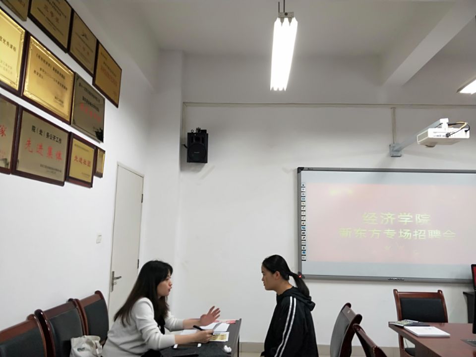 重庆新东方学校于2003年9月25日注册成立,它是新东方教育科技集团旗下的第九所分校,从成立之初重庆新东方就以综合类外语培训为主业,其岗位需求与新葡萄官网国际经济与贸易、贸易经济、经济学、英语等专业比较对口。首先,新东方罗经理放映了宣传片,引出:新东方是谁?新东方能给你带来什么?你可以来做什么?她介绍了新东方集团、重庆新东方的发展、团队构建、企业文化等。针对同学们关心的人才培养、晋升以及待遇福利等做了详细阐述。然后,在新东方任职的15级贸经二班的唐心月学姐进行了经验分享,她讲述了自己从助教到助教长再到学业规划师的历程,并针对同学们提出的如法定节假日的调休、平均薪资等问题进行解答。随后,王书记表示教育是朝阳产业,鼓励同学们积极尝试,多与用人单位工作人员沟通交流,找到自己的兴趣所在,识别自我。最后,新东方工作人员组织了现场面试,与同学们进行了单独的沟通交流。