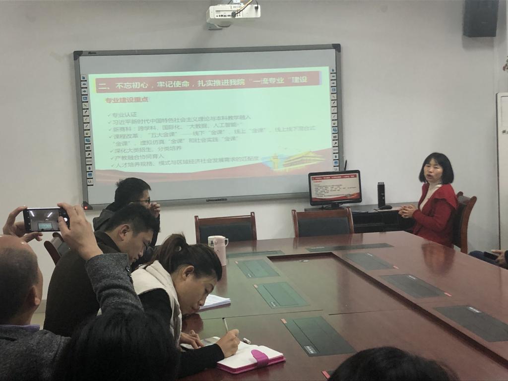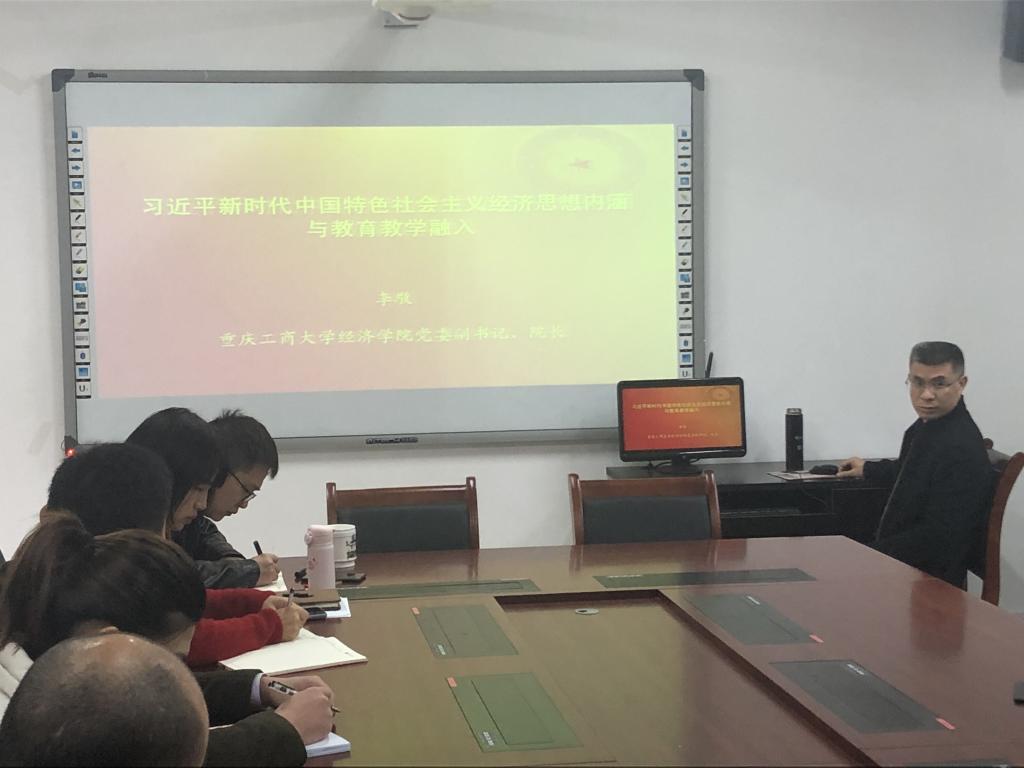 首先,李敬院长对学院前一阶段开展“不忘初心,牢记使命”主题教育的情况进行了简单回顾,并就习近平中国特色社会主义经济思想内涵与教育教学融入做了专题教育,他强调教育教学要跟上时代发展,不忘教育工作者的初心,将习近平中国特色社会主义思想切实融入到教育教学中去,培养好新时代社会主义事业的建设者与接班人。宋瑛副院长以习近平高等教育思想与本科教学改革为题,对党员教师们提出教学改革创新的引导性建议,从专业认证、新商科建设、课程改革、产教融合协同育人等角度为党员教师们上了生动的一课。黄潇副院长从学习十九届四中全会精神出发,对如何推动经济高质量发展提出了自己的解读,并呼吁党员教师要将学习贯彻党的十九届四中全会精神作为当前和今后一个时期的重要政治任务,将学习贯彻成效体现到推动教学、科研高质量发展上来。