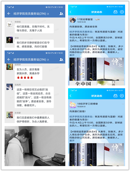 悼念仪式结束后,在新葡萄8883官网AMG党员服务站曲容良站长的带动下,同学们纷纷在群里倾诉哀思,“清明追思布谷鸣,家国永念康子春。”“以凡人之躯,比肩神明!”“我们的岁月静好都是你们在守候,感恩英雄,向你们致敬!”每一句都饱含同学们对英雄最真挚的敬意与最深切的思念。他们用血肉之躯抵抗病毒,以满腔热血奋战“疫”线,而我们能做的就是守护他们用生命换来的成果,用行动告慰逝去的同胞。