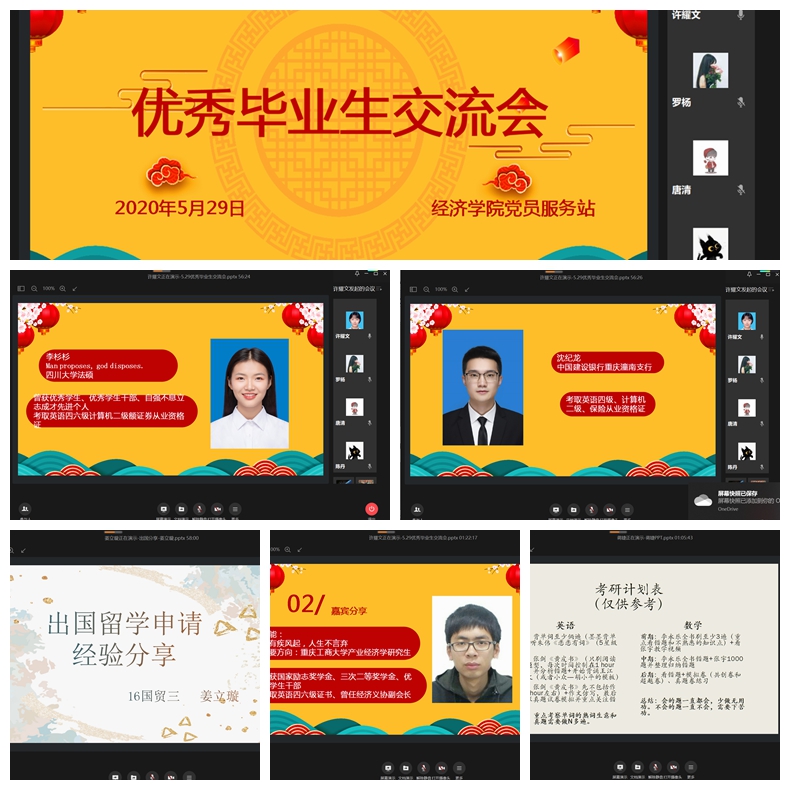 2020年5月29日晚,新葡萄8883官网AMG党员服务站成功举办本院2020届优秀毕业生分享交流会。本次分享会邀请到了六位即将毕业的学长学姐分享考研学习、面试工作等方面的经验和感悟,与同学们进行了一次线上的交流。同时,到场嘉宾有新葡萄8883官网AMG王小玲书记、于频副书记和党员服务站指导老师郝颖老师以及300位新葡萄8883官网AMG学子。
