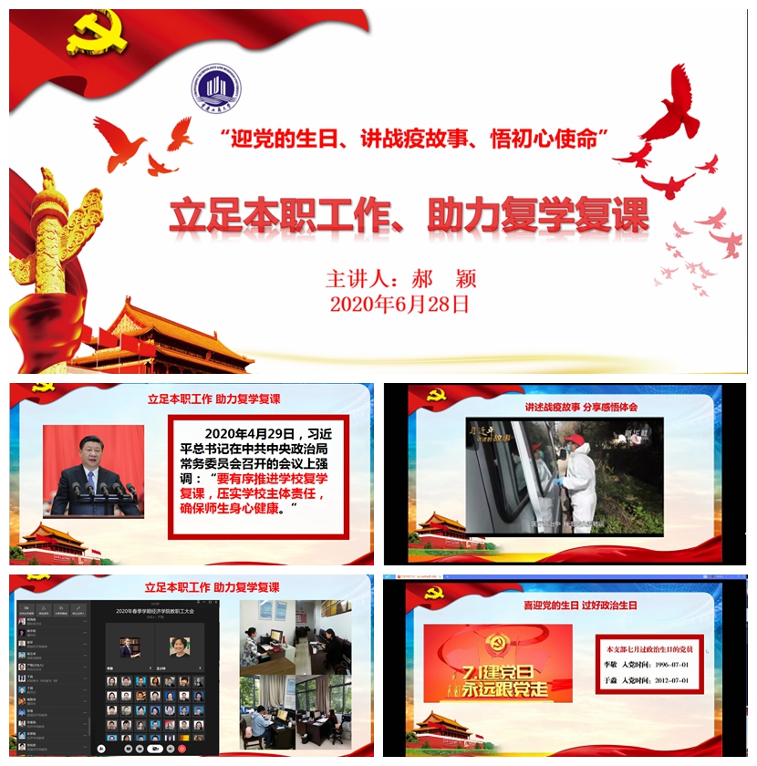 首先,支部书记郝颖同志讲党课——“立足本职工作,助力复学复课”。她讲到,中国战“疫”积累起来的经验做法总结起来就是“战‘疫’中国策九字诀”。同时,她分享了疫情防控期间为了助力复学复课,新葡萄8883官网AMG学工队伍每天关注学生动态和健康数据上报,做好学生复课的各项服务工作,自己也临危受命从2020年1月28日起组织心理氧吧工作室成员开通线上心理咨询,服务了135位同学,及时干预3起严重心理危机;新葡萄8883官网AMG办公室也积极加强教师线上办公技能培训,为师生线上教学服务等。