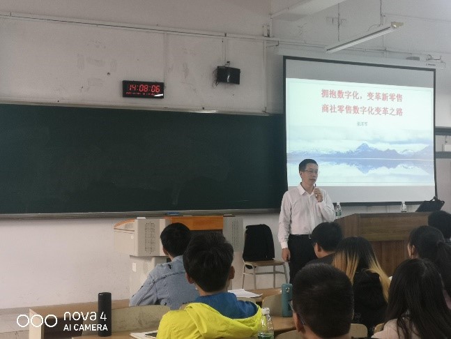2020年11月10日下午2点,2019级贸易经济专业“零售学”课程“行业精英进课堂”教学活动在博智楼208教室举行,153人的阶梯教室几乎座无虚席。本次活动由教务处副处长宋瑛副教授主持,邀请新葡萄官网国家级经济学实践教学基地重庆商社(集团)人力资源部张泽军部长作该课程教学内容之一的《拥抱数字化变革新零售——商社数字化之路》的教学授课。