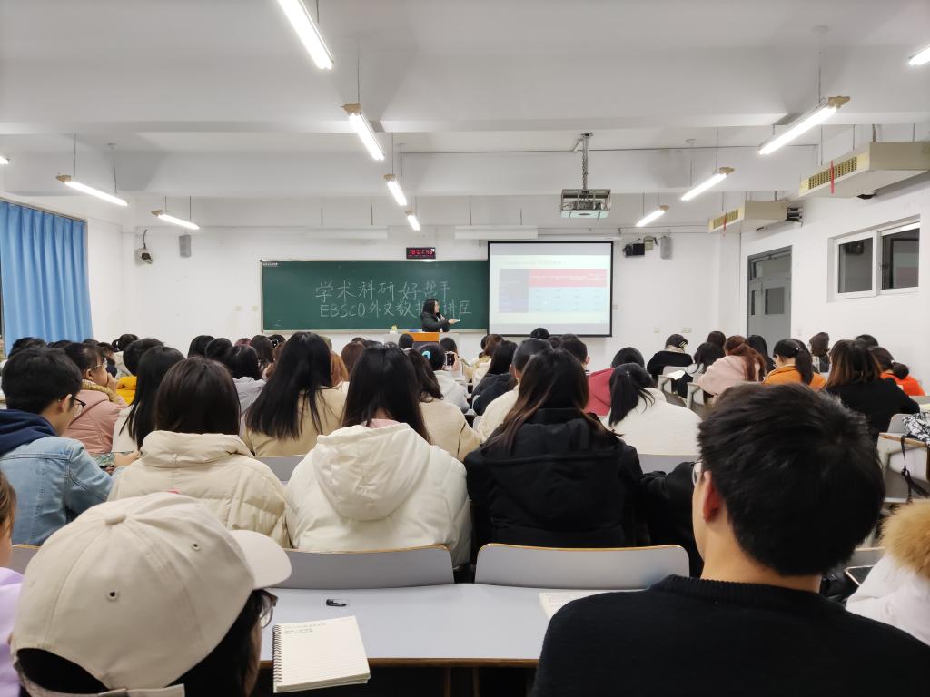 为了营造良好学习氛围,提升学院学生学习学术写作与信息检索的能力,新葡萄8883官网AMG联合图书馆于11月25日在博智楼301召开“学习科研好助手,EBSCO外文数据库”专题讲座。本次培训由EBSCO外文数据库的资深培训师胡文婷老师主讲,学院本科、研究生100多人参加了此次讲座,全场座无虚席。