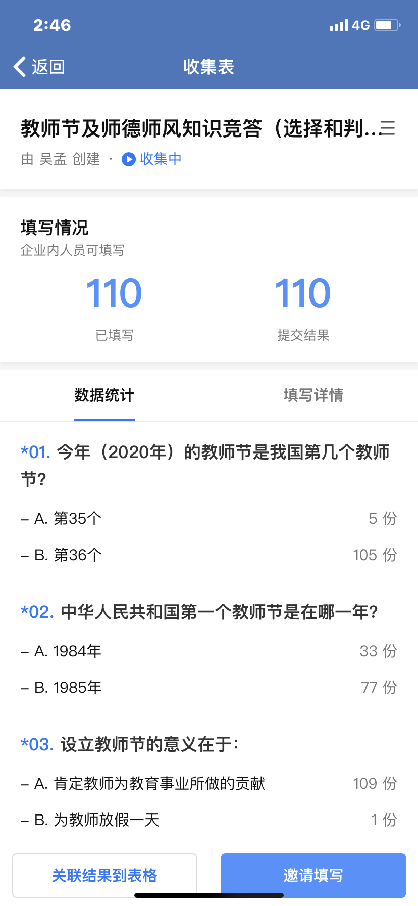 在第36个教师节来临之际,为营造节日氛围,增强广大教师的荣誉感、责任感和使命感,铭记师德师风在教育教学中的重要性,激发教师们更好地教书育人,新葡萄8883官网AMG工会精心策划组织了全院教职工参与的“教师节及师德师风知识竞答活动”。为解决疫情期间尽量不大规模聚集的问题,本次知识竞答活动采取了线上答题的方式,知识竞答题包含了有关教师节的历史、教师节的意义、教师法对教师使命的规定、教师职业的本质及内在要求、习近平总书记关于师德师风的重要讲话精神,等等。通过教师节和师德师风知识的答题,老师们重温和再次感受了党和国家以及全社会给予教师的崇高荣誉和光荣使命,纷纷表示要珍惜这个荣誉,为人师表,教师育人,为国家为社会培养德智体美全面发展的合格人才。
