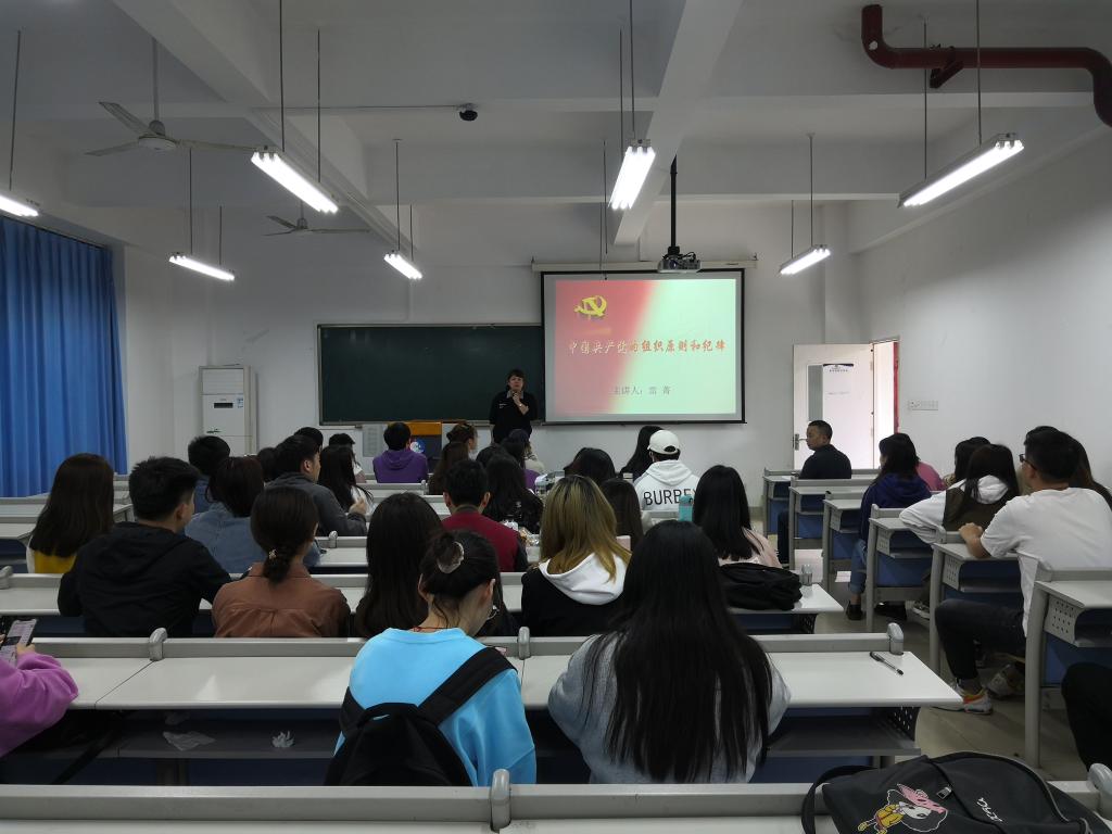 2021年4月21日中午12:30在田家炳书院410教室,新葡萄8883官网AMG专职组织员雷菁讲了题为《中国共产党的组织原则和纪律》党史学习专题党课,学生本科一支部、学生本科二支部、学生研究生二支部三个支部共90名党员听了党课。