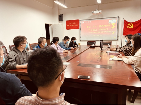 在会议上,李自维书记组织党员同志们对党的二十大报告开展学习讨论,谈认识、亮态度,推动党的二十大精神落地生根,取得实效。李自维书记强调,面对学校突发的新冠肺炎疫情,作为党员教师们要强化实干担当,在行动上紧跟紧随,要坚持用党的二十大精神为指引,把党支部“战斗堡垒”筑在疫情防控最前沿,进一步振奋精神、鼓足干劲、强化举措,以越是艰难越向前的韧劲、狭路相逢勇者胜的狠劲,以实干实绩书写贯彻落实党的二十大精神的优异答卷。支部教师党员邓雪霜表示,面对疫情我们应不惧不退,要用奉献和实干担当起时代赋予的重任,为筑牢疫情防线提供“硬核保障”。支部教师党员车四方表示,本次主题党日活动的开展为坚守在疫情防控一线的我们注入了“强心剂”,激励工商人身深怀爱国之情、砥砺强国之志、力践报国之行,以更昂扬的姿态为党的二十大献礼。