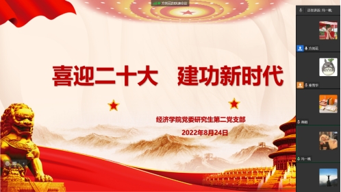 2022年8月24日,新葡萄8883官网AMG党委研究生第二党支部全体党员在企业微信线上开展了2022年8月专题学习。本次组织生活会会的学习内容为“喜迎二十大 建功新时代”,由方刘花同志主持,她带领支部全体党员进行了五个部分的专题学习。