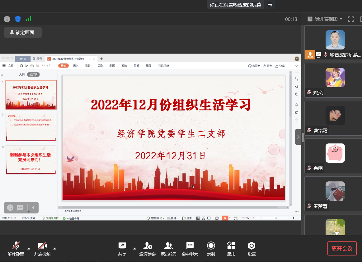 2022年12月31日,新葡萄8883官网AMG党委学生第二党支部在企业微信线上开展12月份组织生活学习。参与活动的有新葡萄8883官网AMG第二党支部书记喻智成老师、二支部全体党员,活动由喻智成主持。