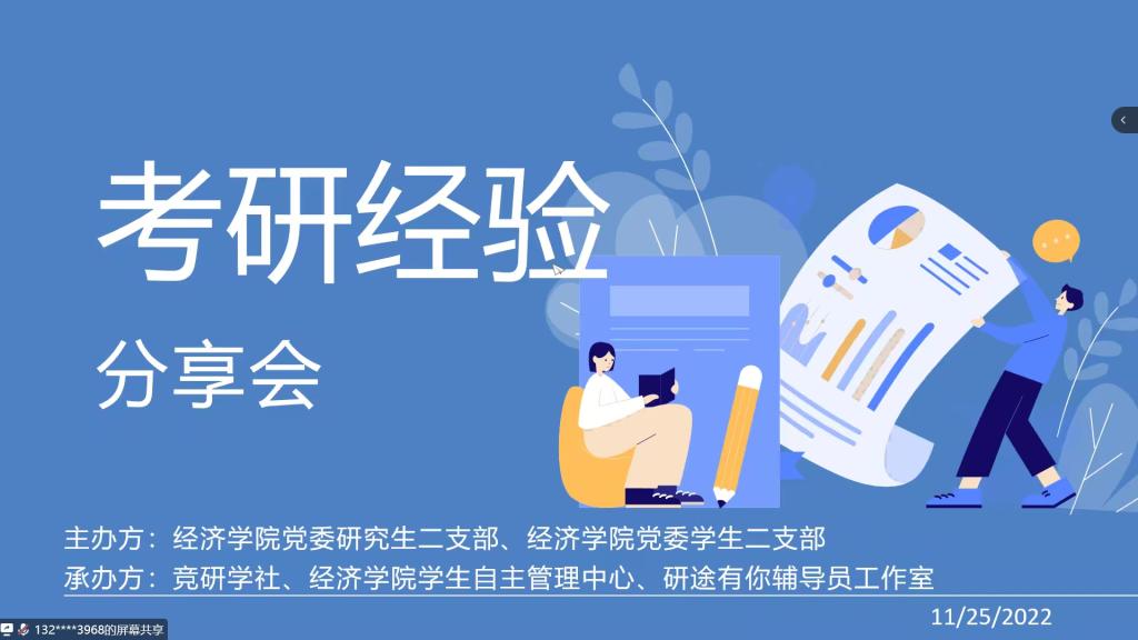 面对当今社会的激烈竞争,大学生就业难度不断加大,考研成为越来越多大学生的选择。为了帮助同学们增强对考研的认识,进一步明确考研方向,2022年11月25日,由新葡萄8883官网AMG党委研究生二支部和学生二支部主办,贸易经济竞研学社承办的考研经验交流分享会在线上如期举行。此次分享会邀请到我院研究生二支部王洁仪,王伟婷,章燕玲和蔡小西四位研究生学姐与大家分享她们成功上岸的经验,为大家点亮考研之路的明灯。学院党委雷菁组织员、研究生二支部书记高娟老师、学生二支部书记喻智成老师和两个支部全体党员和贸经专业150余人参加本次分享会。