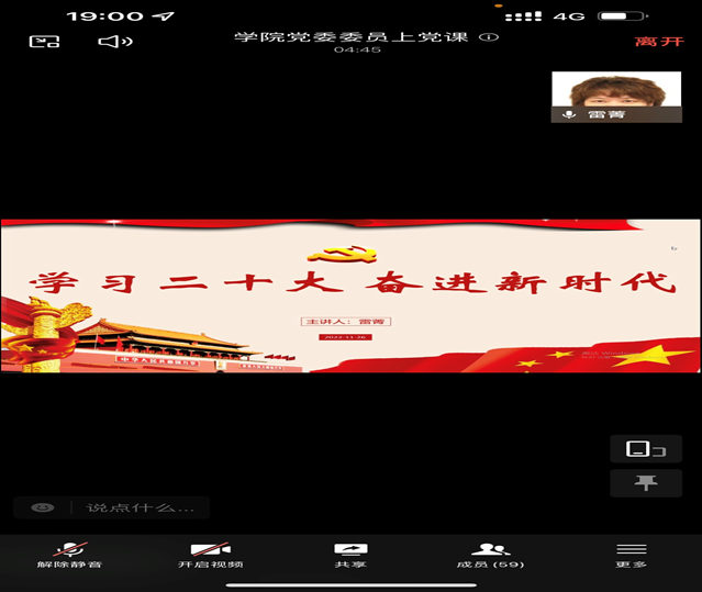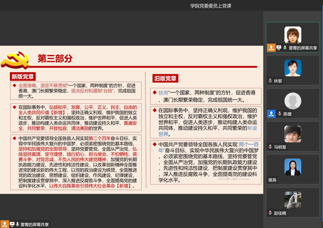 为深入学习宣传贯彻党的二十大精神,扎实推动党的二十大精神在学院落地见效,11月27日,新葡萄8883官网AMG党委委员、组织员雷菁通过企业微信平台为教工五支部、研究生一支部 、学生一党支部和学生三支部等4个支部80余名党员做题为《学习二十大,奋进新时代: 学习中国共产党章程(修正案)》专题党课,全体师生党员认真聆听。