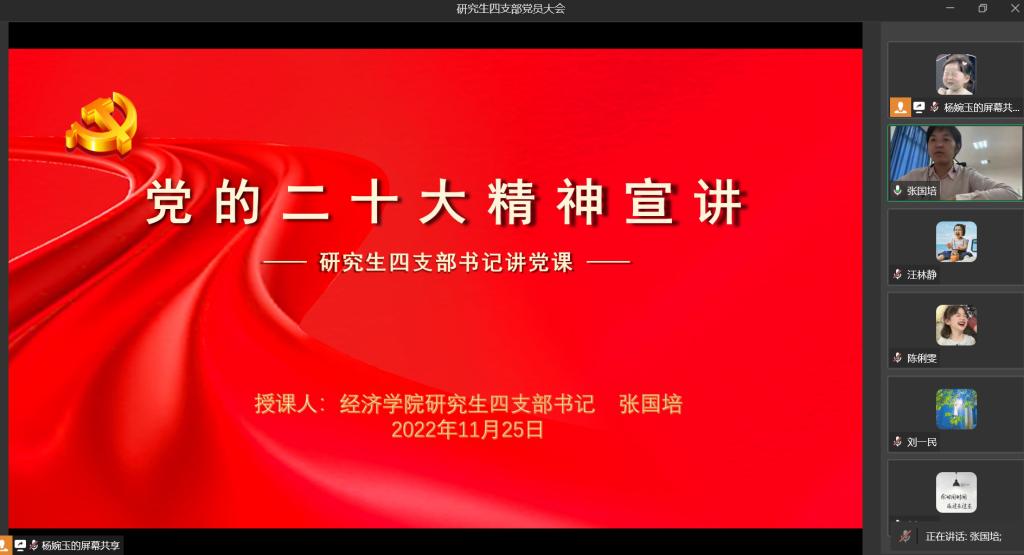 11月25日下午2点,新葡萄8883官网AMG研究生四支部通过企业微信开展了支部书记讲党课活动,研究生四支部书记张国培带领支部党员同志学习党的二十大精神。本次讲党课活动由研究生四支部宣传委员杨婉玉主持,研究生四支部全体党员参加学习。