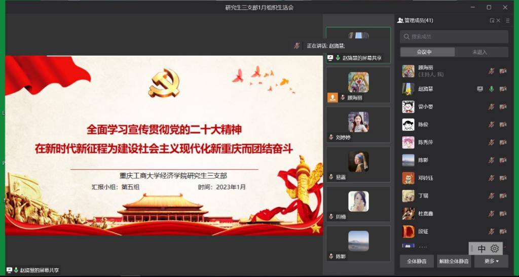 2023年1月13日下午,新葡萄8883官网AMG研究生第三党支部在企业微信线上会议室开展了1月组织生活会,深入学习中国共产党重庆市第六届委员会第二次全体会议内容。本次会议由支部书记薛晶月主持,研究生第三党支部全体党员参加。