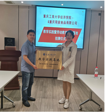 6月23日下午,新葡萄8883官网AMG与重庆荷家食品有限公司“教学实践暨劳动教育实践基地”挂牌仪式在荷家食品有限公司总部举行。新葡萄8883官网AMG副院长尹元福副教授、政治经济系系主任林黎副教授、政治经济系教师吴燕博士、梁甄桥博士共同出席了此次活动。重庆荷家食品有限公司总经理阎明星、人力行政部总监周青、人力部总监粟薇、营运经理张明莉、人力行政经理刘丹共同出席了挂牌仪式。