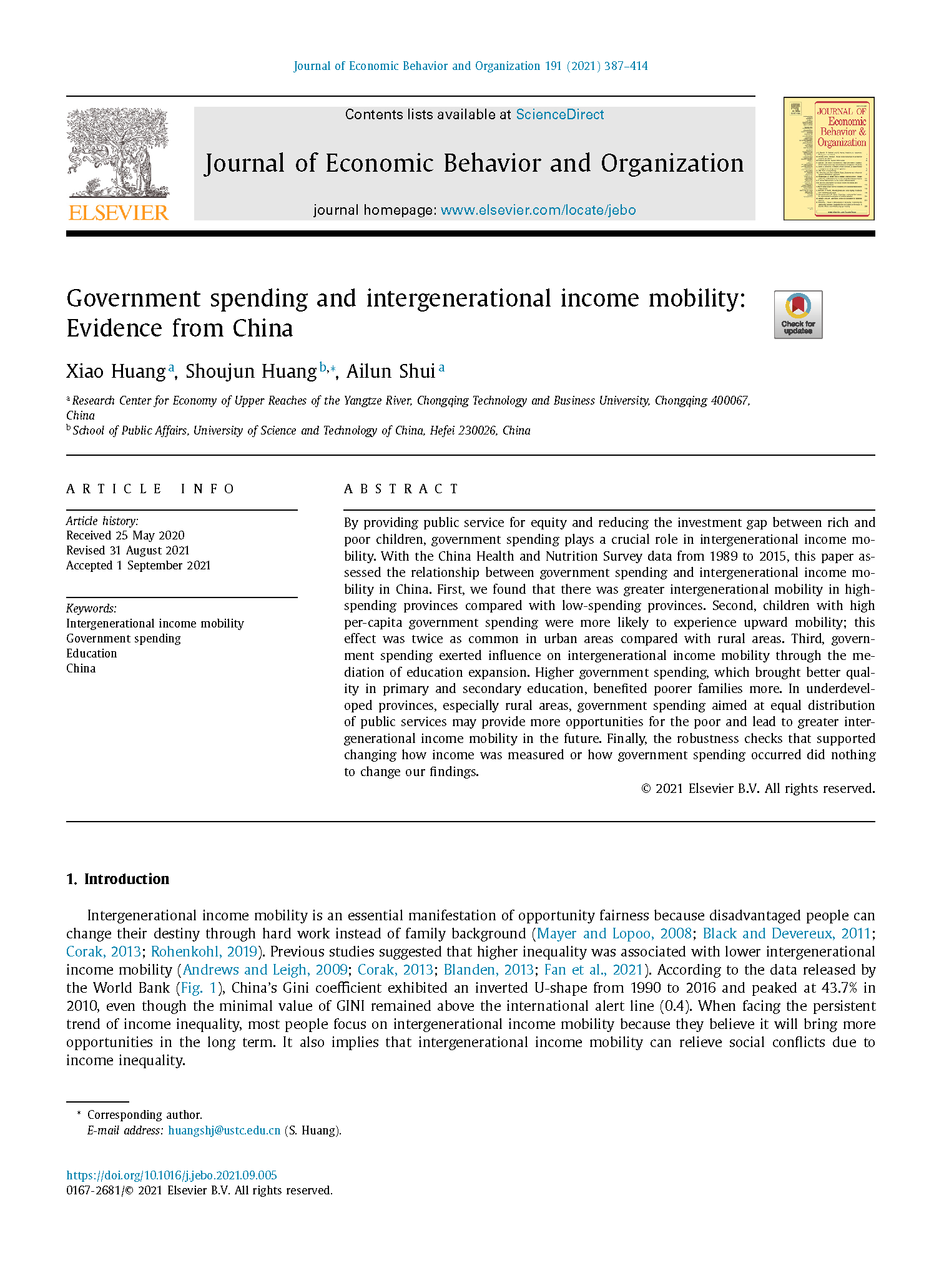 新葡萄8883官网AMG副院长黄潇教授在行为经济学领域顶尖学术期刊《Journal of Economic Behavior and Organization》发表论文《Government spending and intergenerational income mobility:Evidence from China》,这也是新葡萄官网教师首次在该期刊上发表学术论文。论文探讨了政府支出对代际收入流动的影响。通过提供均等的公共服务以及缩减人力资本投资的代际差异,政府支出对代际收入流动有着重要作用。论文研究发现,政府支出水平越高的地区通常代际收入流动性也相对更大,并且这些地区的向上流动概率更高。对欠发达地区而言(特别是欠发达的农村地区),政府在公共服务均等化方面的支出,更能够给经济困难群体创造更大的代际流动可能
