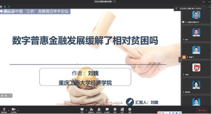 新葡萄8883官网AMG青年教师刘巍博士做了《数字普惠金融发展缓解了相对贫困吗?》的学术报告。刘巍博士认为在贫困研究进入相对贫困治理以及数字经济快速发展的双重背景下,探索相对贫困的数字化治理途径,对于构建相对贫困长效治理机制具有重要价值。刘巍博士基于中国家庭追踪调查2014—2018年的数据,将相对贫困区分为主观和客观两种类型,并运用条件混合过程(CMP)等研究方法,分析了数字普惠金融对居民相对贫困的影响。刘巍博士研究发现数字普惠金融指数每增加1%,客观相对贫困的发生概率下降2.12%,主观相对贫困的发生概率下降0.96%。刘巍博士认为数字普惠金融发展有效缓解了城乡居民的相对贫困状况,其作用机制在于数字普惠金融通过降低信贷成本、积累人力资本和社会资本缓解客观相对贫困,通过积累人力资本和社会资本缓解主观相对贫困。