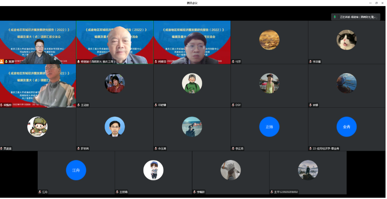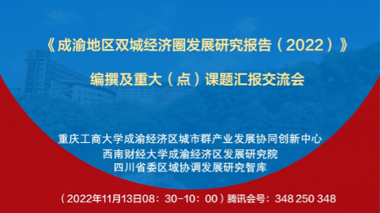 2022年11月13日,《成渝地区双城经济圈发展研究报告(2022)》编撰及重大(点)课题汇报交流会以在线会议方式举行。《成渝地区双城经济圈发展研究报告》是新葡萄官网成渝经济区城市群产业发展协同创新中心推出的标志性咨询成果,该报告以皮书形式按年出版,旨在对成渝地区双城经济圈的发展进行多方位的评估,并提出推进成渝地区双城经济圈高质量发展的政策建议。2021年度的《成渝地区双城经济圈发展研究报告》已由经济管理出版社正式出版。