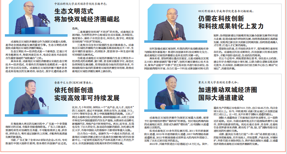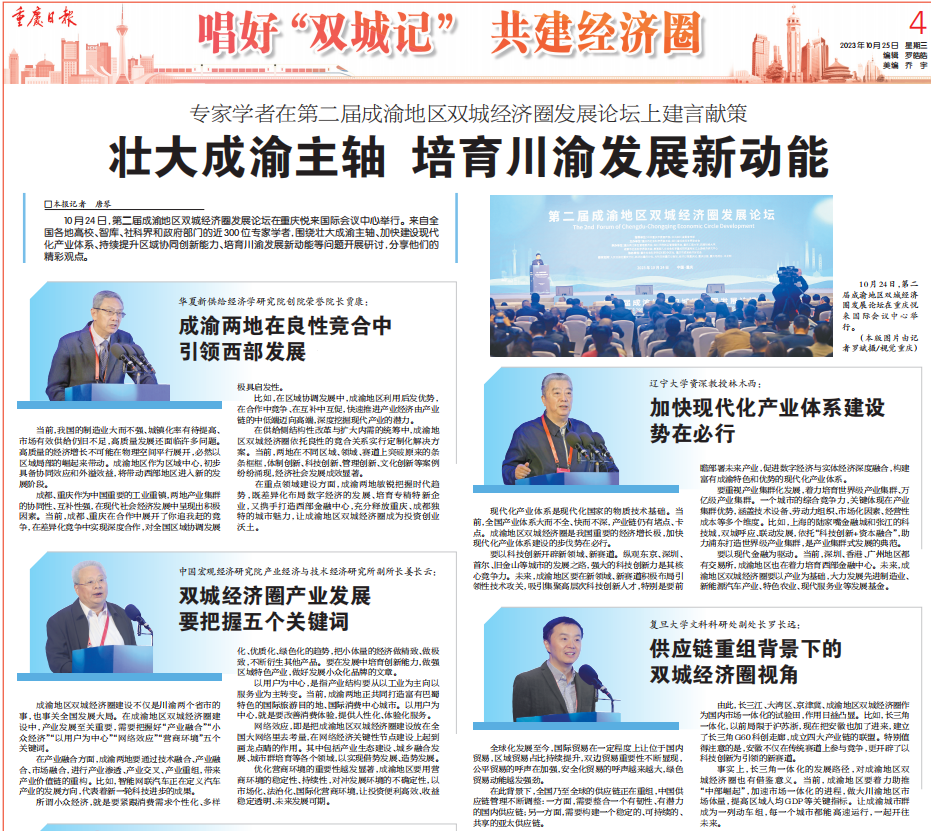10月24日,由中共重庆市委宣传部、中共四川省委宣传部指导,重庆市社会科学界联合会、四川省社会科学界联合会主办,重庆两江新区管理委员会、四川天府新区管理委员会、新葡萄8883官网AMG、西南财经大学、成都市社会科学界联合会、教育部人文社会科学重点研究基地长江上游经济研究中心等单位联合承办,并由新葡萄8883官网AMG作为论坛承办实施单位的第二届成渝地区双城经济圈发展论坛在悦来国际会展中心顺利举行。来自全国各地高校、智库、社科界和政府部门的近300位专家学者,围绕壮大成渝主轴、加快建设现代化产业体系、持续提升区域协同创新能力、培育川渝发展新动能等问题开展研讨,建言献策,分享他们的精彩观点。