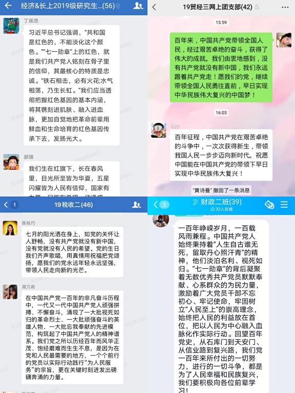 通过此次学习使同学们深刻了解了建党百年的伟大历程,对百年征程中共产党人的初心使命有了更深的体会。让我们感受到我党始终坚持一切从人民利益出发,全心全意为人民服务的宗旨,不忘初心,牢记使命,为人民谋幸福,为民族谋复兴,为世界谋大同。请党放心,强国有我!广大经济学子定接好时代接力棒,以青春之我、向上之我,答好时代考卷,为中华民族伟大复兴的中国梦而不懈奋斗。