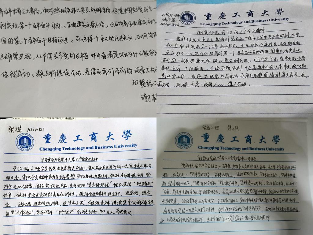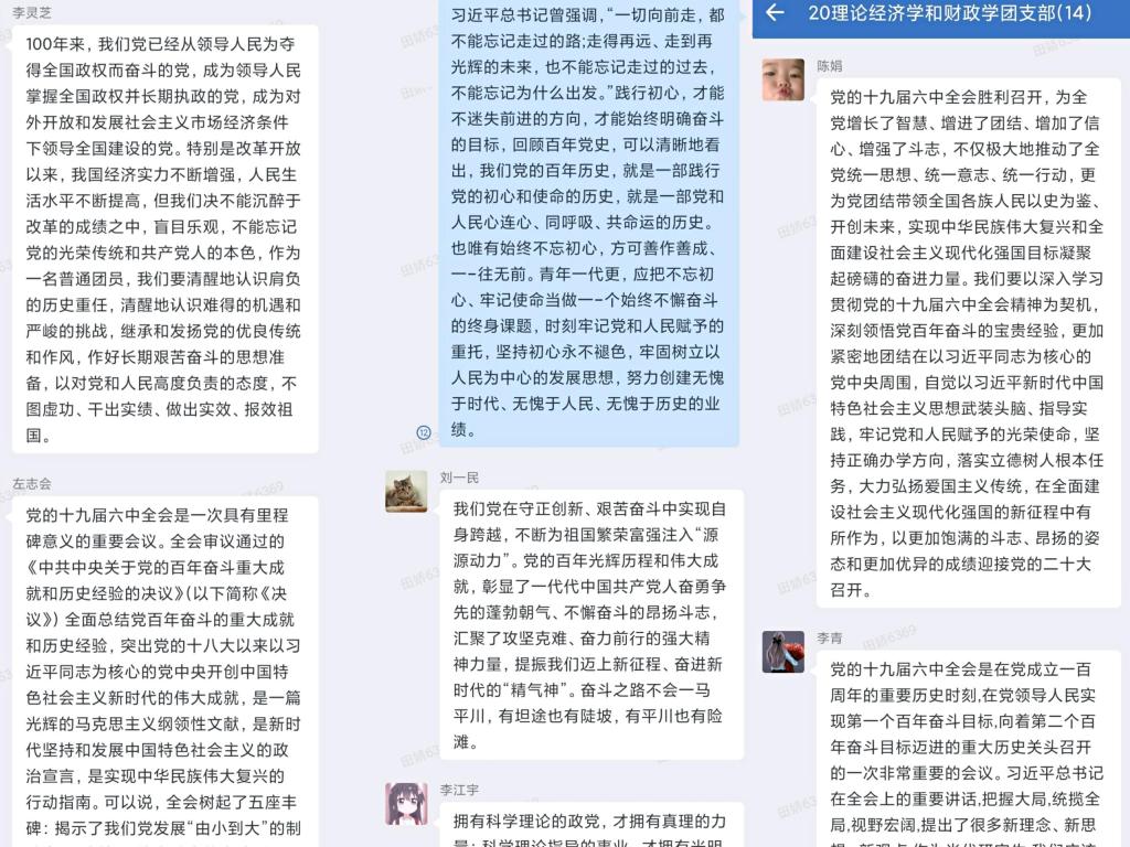 同学们认真观看并且学习了习总书记关于“十九届六中全会的报告”,会后,各支部采取多样化形式展开了学习交流。19经济一班的同学们在观看完十九届六中全会公报后,在班级群里展开了热烈的讨论,他们就“四个伟大成就”、“党的百年奋斗的五大历史意义”以及“十大经验”谈起了自己的理解。同学们谈到:身为一名在校大学生,学习党的十九届六中全会令自己深受鼓舞。一百年来,党领导人民浴血奋战、百折不挠,创造了新民主主义革命的伟大成就;又领导人民自信自强、守正创新,创造了新时代中国特色社会主义的伟大成就。正是因为党的百年奋斗,我们的生活才越来越美好。20贸经二班的同学们则是在观看完十九届六中全会公报后,纷纷在纸上写下了自己的感悟和对党的美好祝愿。他们写到,党的十九届六中全会是党中央在建党百年重要历史时刻召开的一次具有里程碑意义的大会。作为新时代的青年大学生,我们倍感振奋、倍受鼓舞。这也更加激励我们要不忘初心,牢记使命,坚定理想信念,勤奋学习,练就过硬本领,不负历史使命,不负时代召唤,不负青春韶华,为实现中华民族伟大复兴的中国梦贡献自己的力量!
