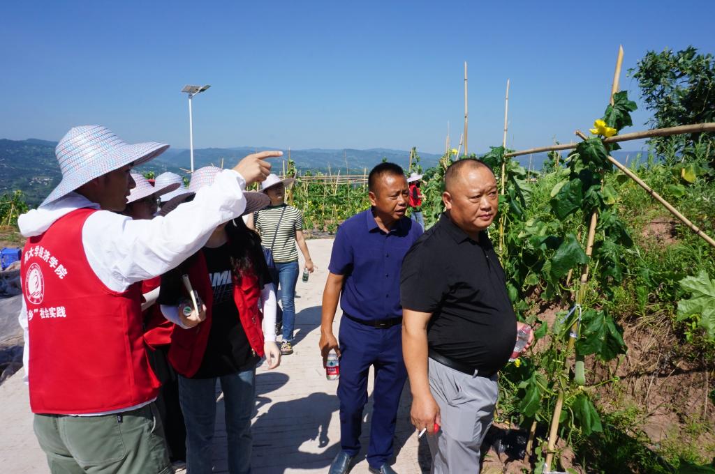 在南坪村党支部书记周在忠的带领下,项目组成员来到南坪村蔬菜基地,对南坪村蔬菜基地实地走访,了解了“业主+农户”独特发展模式,不仅发现南坪村蔬菜基地完全具备作为蔬菜基地的现实条件,而且同学们从与村民们的亲切交谈中了解到,村民们也非常希望能够积极响应国家关于劳动教育的号召,使南坪村成为劳动教育的示范场所。除此之外,项目组成员实地学习了农作物分区种植经验,经营菜园的农户们详细介绍了从基地锄草、犁田、到栽种、管护、采收等具体情况,极大提高了同学们对蔬菜种植的感性认知。之后,项目组成员深入田间地头参与劳动,在村民的热情指导下,项目组成员在高粱地里清理杂草、在菜地里采摘豇豆、在瓜田里收割南瓜,炎炎烈日也抵挡不住劳动带来的喜悦,每一份丰收都是劳动的成果。
