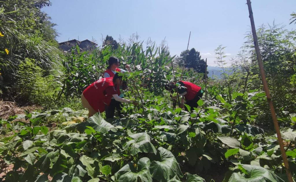 (空中菜园项目组成员在蔬菜地里采摘豇豆)