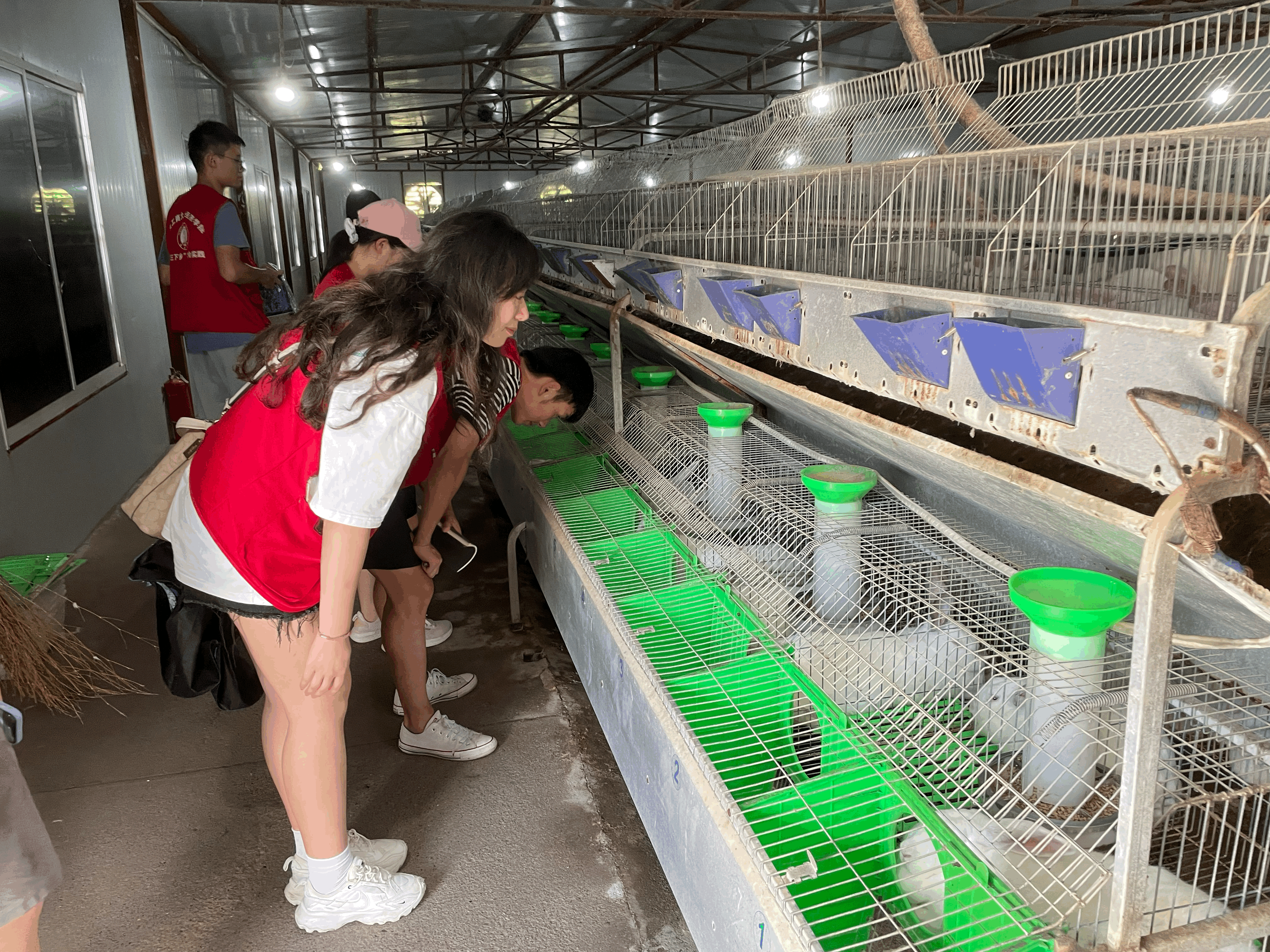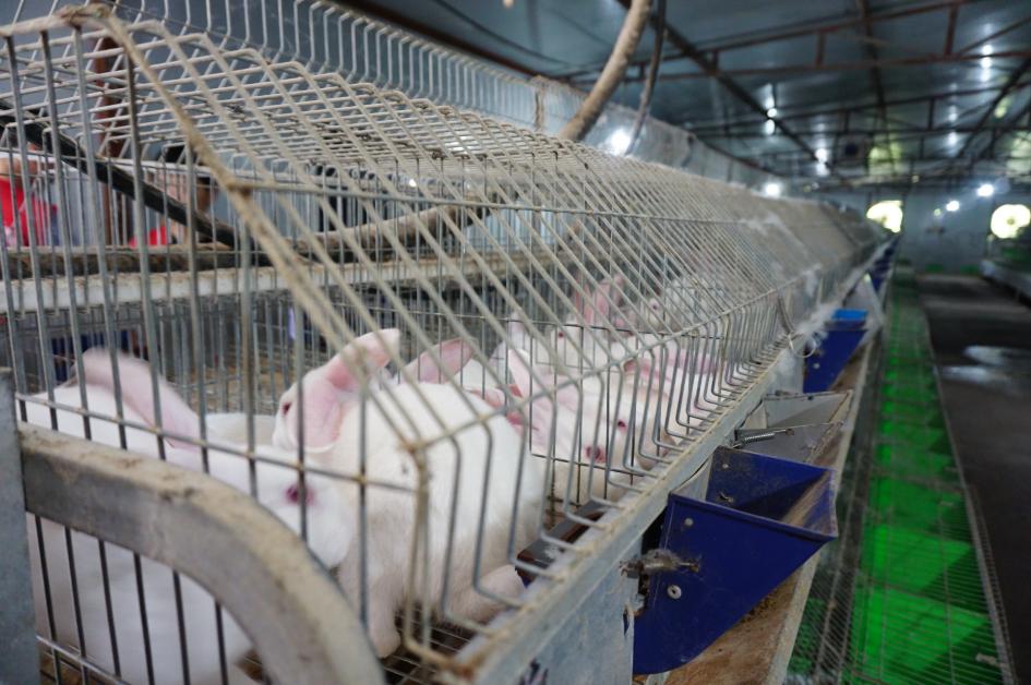 (促进团成员正在对新一批培育的肉兔进行观察)