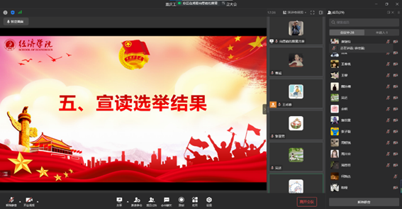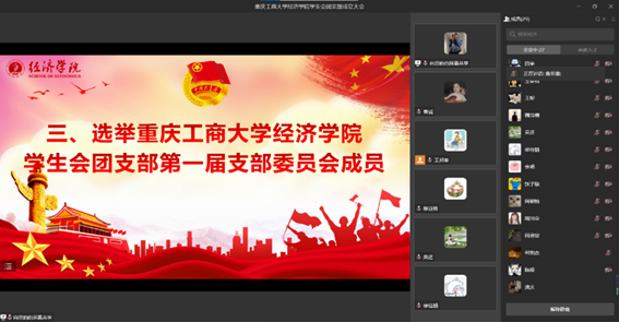 首先,主持人宣读了《关于同意成立新葡萄8883官网AMG学生会团支部的批复》,并向与会人员介绍了学院学生会团支部的基本情况。紧接着,按照《共青团章程》规定程序,大会以线上投票表决的方式审议通过了监票员、计票员和支部委员会候选人名单,随后,大会以无记名投票的方式选举王邦春、余明、张子璇为新一届学生会团支部委员会委员。经学院分团委批准,由王邦春同学担任团支部书记,余明同学担任组织委员,张子璇同学担任宣传委员。