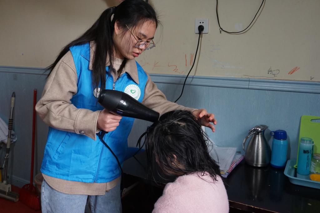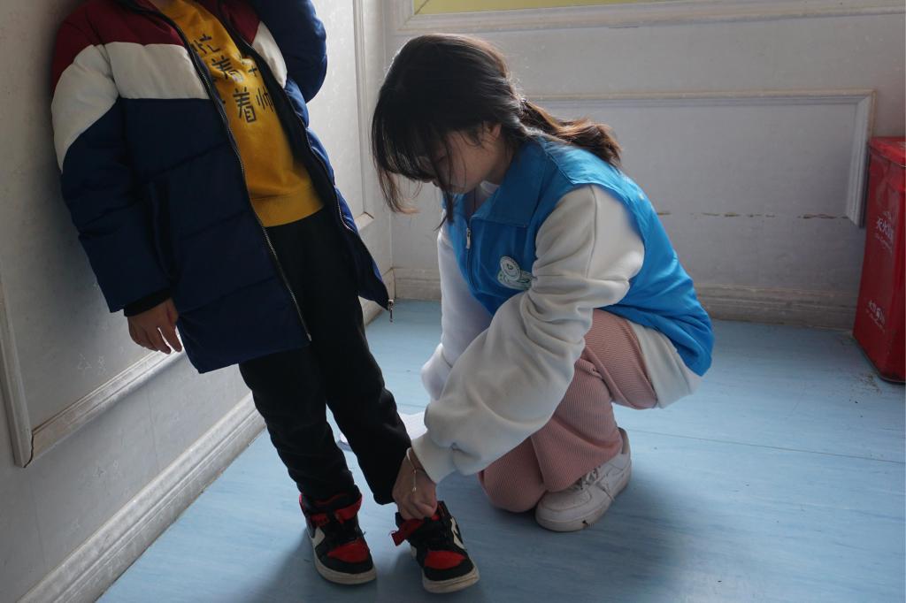 志愿者们走进乐一融合幼儿园,开启了用爱心温暖孤独的旅程。他们化身为“大朋友”与这群来自星星的孩子交流互动。首先,志愿者们打扫落叶、清洁教室走廊等,为孩子们营造一个舒适的学习环境。随后,在老师的指导下,志愿者陪同孩子们上课,耐心地教他们搭建积木、书写汉字、与他们积极互动,引导他们改善社交障碍,提升他们与人友好交往的能力。志愿者们认真对待每一个孩子,希望从生活到心理上为他们带来慰藉。在这里,每名志愿者负责一到两名孩子的看护工作,协助老师进行日常活动,与孩子建立起双向的联系。志愿者们即使不能将他们带出封闭的世界,但是至少能为他们黑暗的世界带来一丝光亮和温暖,陪伴他们度过平凡却又美好的一天。