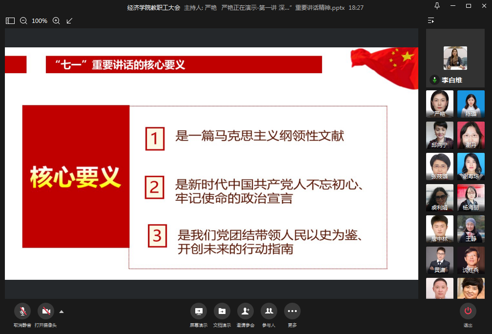 李自维书记表示,深入学习“七一”重要讲话精神,要在理论武装和现实工作中学懂、弄通、做实,吃透精神实质,把握核心要义,更要开展宣讲引导广大师生干部学深悟透讲话精神,确保把讲话精神把握准、理解透、落实好。希望各位老师能够在学习和分享过程中激励奋斗精神,增强使命担当。