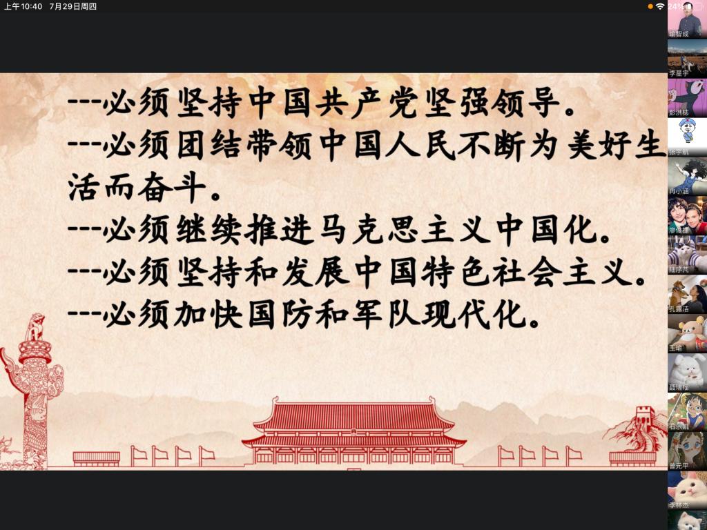 会上,全体党员在喻智成老师的带领下,再次温习了习总书记在“七一”讲话的主要内容。在“七.一”讲话中,习总书记代表党和人民庄严宣告,经过全党全国各族人民持续奋斗,中国实现了第一个百年奋斗目标,在中华大地上全面建成了小康社会,历史性地解决了绝对贫困问题,正在意气风发向着全面建成社会主义现代化强国的第二个百年奋斗目标迈进。习总书记回顾了为了实现中华民族伟大复兴,中国共产党团结带领中国人民,创造了新民主主义革命、社会主义革命和建设、改革开放和社会主义现代化建设、新时代中国特色社会主义四个阶段的的伟大成就。以史为鉴、开创未来,在新的征程上,习总书记强调我们必须坚持中国共产党坚强领导、必须团结带领中国人民不断为美好生活而奋斗、必须继续推进马克思主义中国化、必须坚持和发展中国特色社会主义、必须加快国防和军队现代化、必须不断推动构建人类命运共同体、必须进行具有许多新的历史特点的伟大斗争、必须加强中华儿女大团结、必须不断推进党的建设新的伟大工程才能继续成功,从而在新的征程上更加坚定、更加自觉地牢记初心使命、开创美好未来。在“七.一”讲话中,习总书记表明了我们在香港、澳门、台湾上问题上的态度,一方面我们要维护国家主权、安全、发展利益,维护特别行政区社会大局稳定,保持香港、澳门长期繁荣稳定。另一方面,任何人都不要低估中国人民捍卫国家主权和领土完整的坚强决心、坚定意志、强大能力!同时我们也绝不接受“教师爷”般颐指气使的说教!在“七.一”讲话中,习总书记寄语青年,新时代的中国青年要以实现中华民族伟大复兴为己任,增强做中国人的志气、骨气、底气,不负时代,不负韶华,不负党和人民的殷切期望!最后,习总书记号召全体中国共产党员牢记初心使命,坚定理想信念,践行党的宗旨,永远保持同人民群众的血肉联系,始终同人民想在一起、干在一起,风雨同舟、同甘共苦,继续为实现人民对美好生活的向往不懈努力,努力为党和人民争取更大光荣!