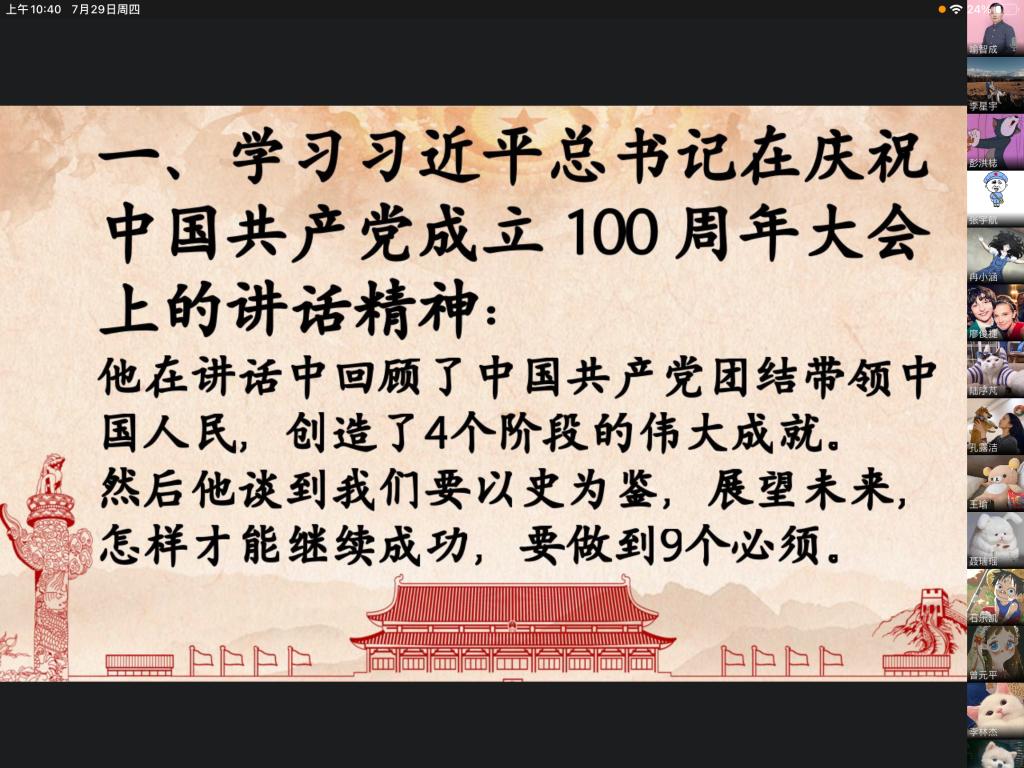 2021年7月29日,学生二支部全体党员通过企业微信学习了习近平总书记在庆祝中国共产党成立 100 周年大会上的讲话精神,会议由支部书记喻智成老师主持,支部全体党员参加会议。