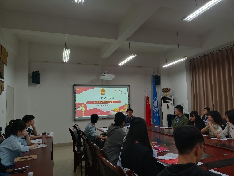 支部书记文理从党的百年历史,是一部“不忘初心、牢记使命”的不懈奋斗史,是一部自我革命、勇立潮头的自身建设史,是一部全心全意为人民服务的艰辛创业史三个方面做了生动讲解。随后,带领全体党员围绕怎样更好地学习党的历史,怎样从历史中进一步汲取前进力量两个方面进行了交流与讨论。最后,勉励全体党员铭记百年党史,用思想武装头脑,用青春书写当代学生党员风采,不忘初心,砥砺前行。